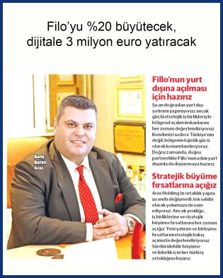 Yönetim Kurulu Başkanımız Barış Baran Aras, Fillo Lojistik ve Aras Holding’in filosunu büyütmeye ve dijital yatırımlarını artırmaya hazırlandığını, teknolojik dönüşüm ve sürdürülebilir büyüme hedeflerine odaklandıklarını Capital Dergisine anlattı.
